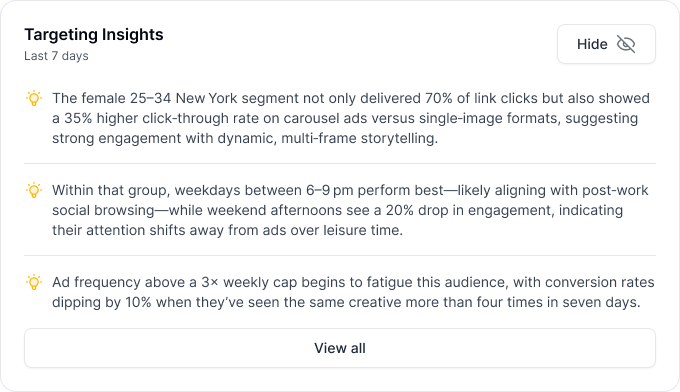 carrotcake continuously analyzes your marketing accounts and surfaces the most important insights over time, helping you prioritize actions, adjust direction, and stay focused as performance changes.